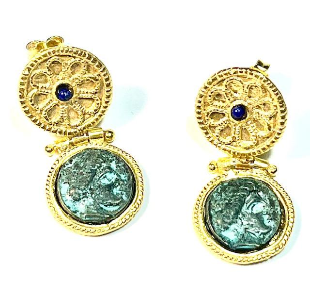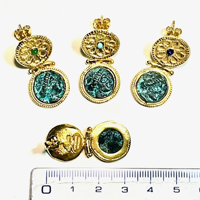 Stud earring in 925 sterling silver/°° 18k gold plated with coins in antiqued bronze.