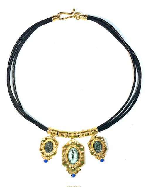 Necklace in 925 sterling silver plated with 18k gold with antiqued bronze coins and leather cord.