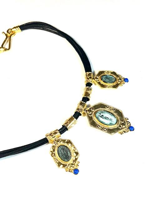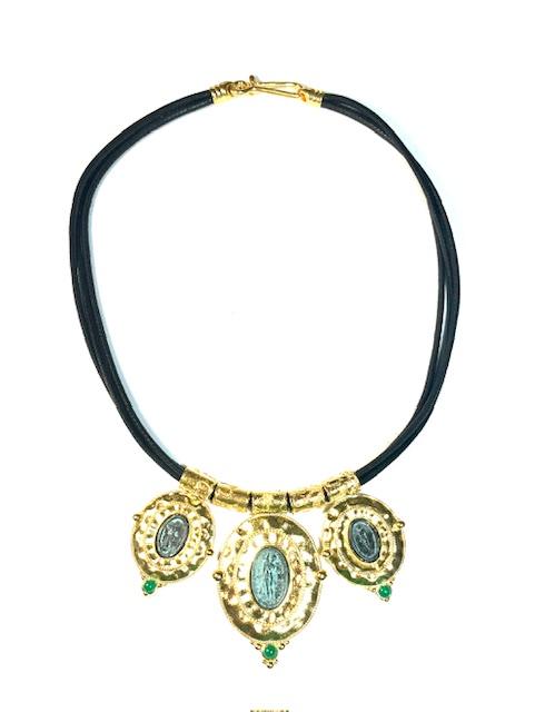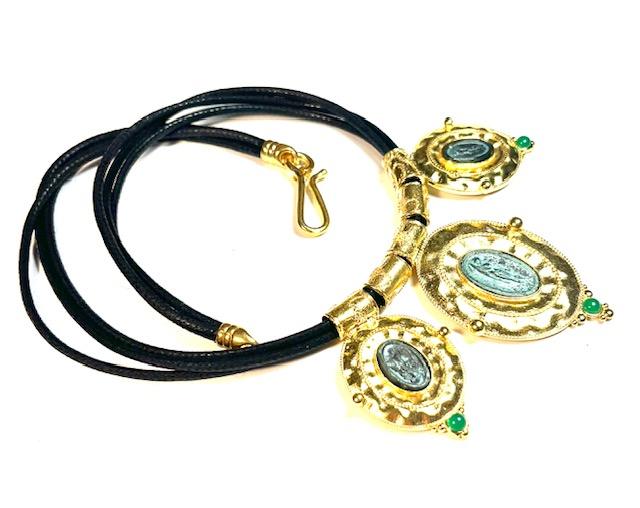 Necklace in 925 sterling silver plated with 18k gold with coins in antiqued bronze and leather cord.