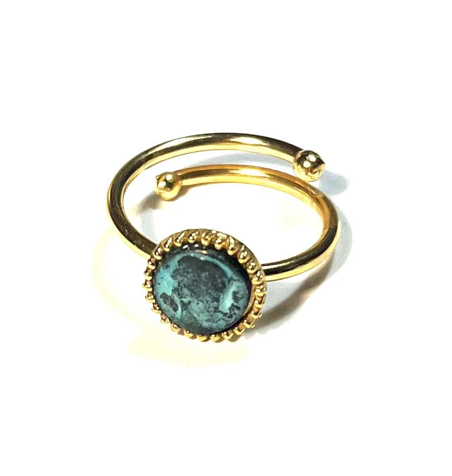 Adjustable ring in 925 sterling silver plated 18k gold with antiqued bronze coin.