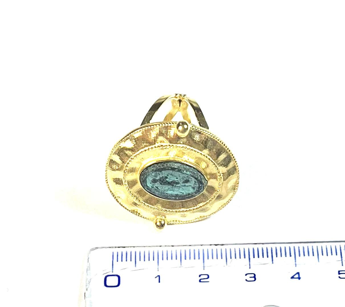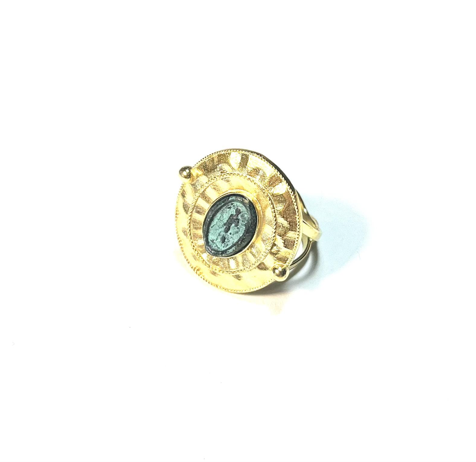 Adjustable ring in 925 sterling silver with antiqued coin. A jewel with an antique and refined charm, this ring catches the eye thanks to its central element: a shield that holds an antiqued coin, symbol of history and authority. The handmade work of the shield enhances its volumes through meticulous chasing, while the two turns of twisted wire that frame it give character and a touch of classic elegance. Perfect for those who love unique details and references to tradition, this ring is a timeless accessory, able to tell an ancient story with a deeply contemporary style.