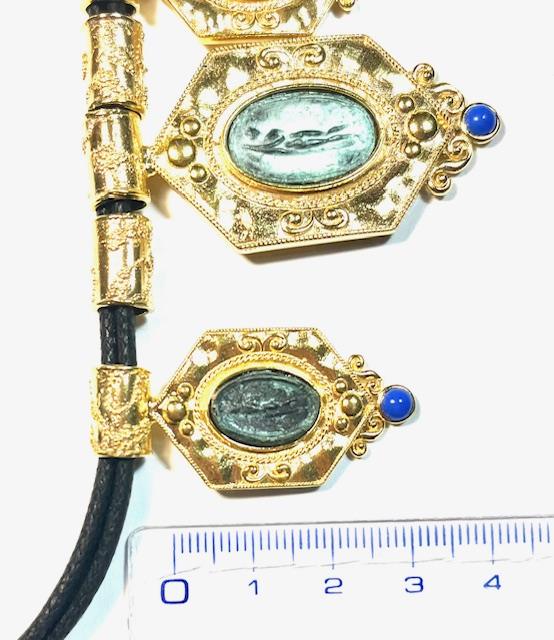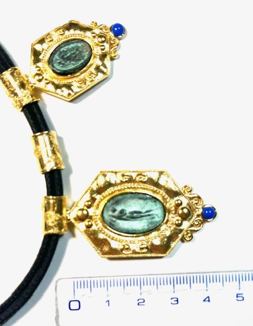 Necklace in 925 sterling silver plated 18k gold with antiqued bronze coins and leather cord. A silver necklace composed of three finely crafted shields: two side elements of equal size and a larger central one, where antiqued bronze coins are set, symbol of a legacy that spans centuries. The coins are enhanced by a double round of twisted wire that emphasizes the chasing, crafted with great care to highlight volume, shape and character, giving movement and strength to the entire composition. A statement jewel with strong symbolic impact, created for those who want to wear a fragment of history with elegance and contemporary sensibility.
