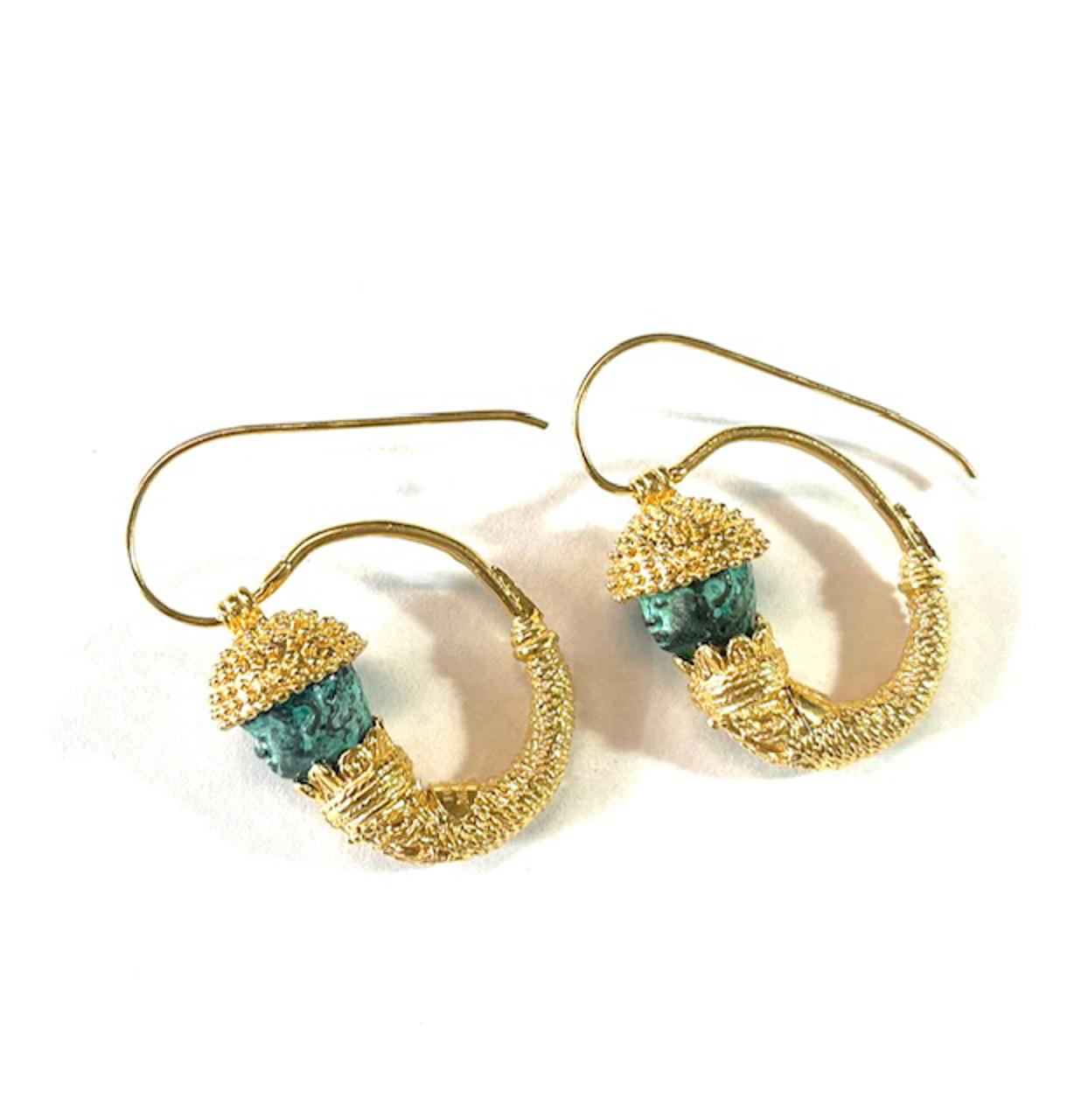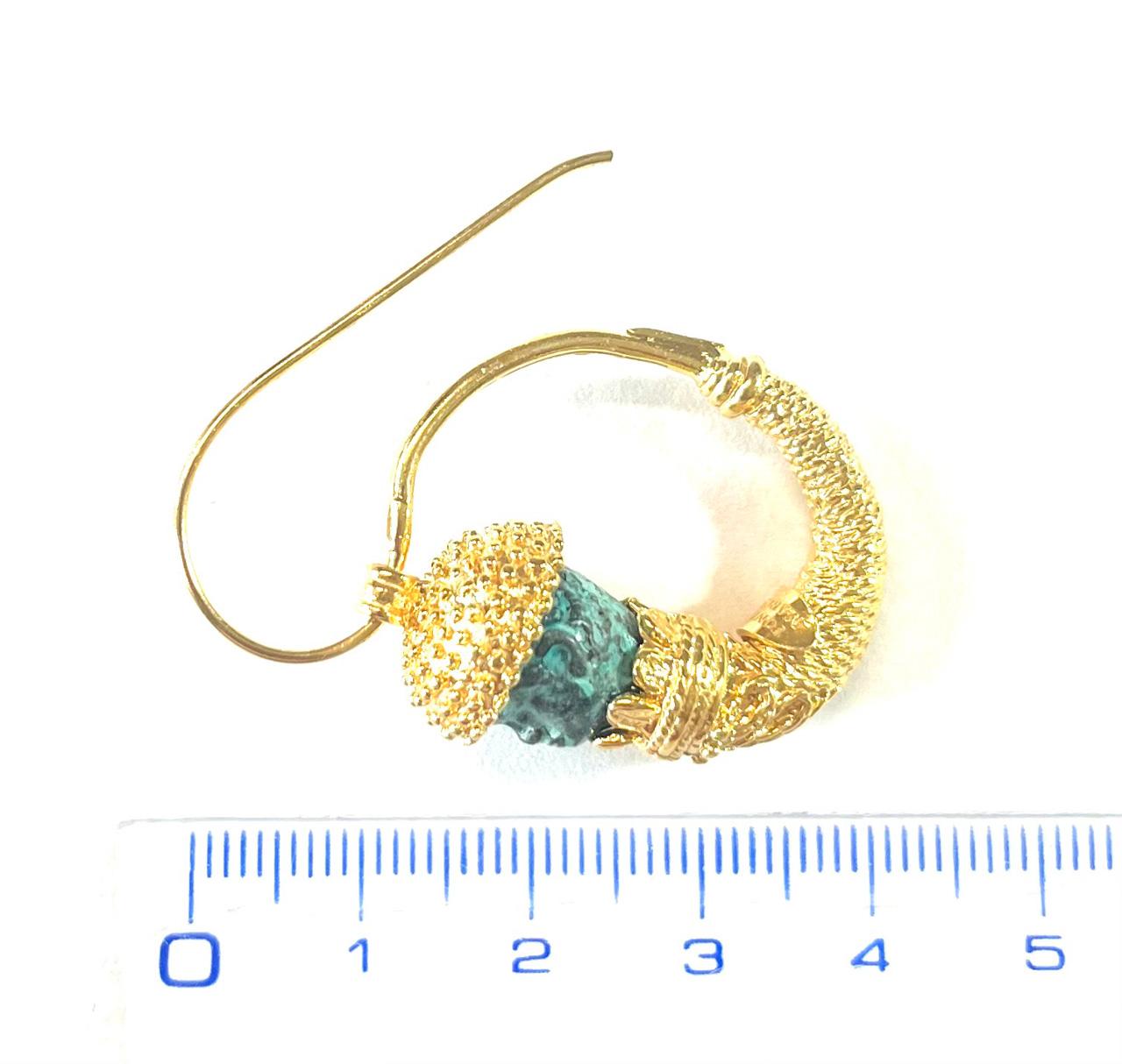 Hook earring in 925 sterling silver/°° 18k gold plated with antiqued bronze coins. These elegant earrings feature a bronze head inspired by the iconic Moors, figures often associated with Etruscan culture, symbol of elegance and nobility in antiquity. On the upper part of the head, a small hat with granulation workmanship adds a touch of refinement. The combination of bronze and worked silver creates a fascinating contrast, making the jewel a tribute to handmade tradition and the mastery of ancient peoples. The Etruscan Moors, with their distinctive features, were representations of deities or high-class figures, testifying to their cultural significance and their central role in society.