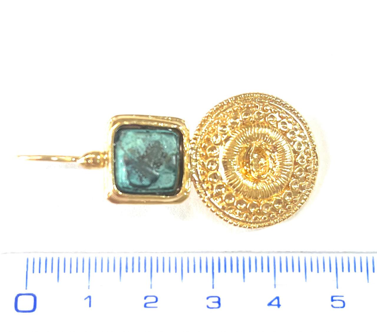 Hook earring in 925 sterling silver/°° 18k gold plated with antiqued bronze coins. This refined earring features a bronze coin set in a polished square bezel. In the lower part, a shield recalls the bronze studs of the Todi tomb. These ornaments, inspired by the decorations of armor and ceremonial shields, give the jewel a historical and symbolic charm. The disc is embellished with repeated decorative elements that enhance its symmetry and elegance. An accessory with strong artistic value, perfect for those who love history and craftsmanship.