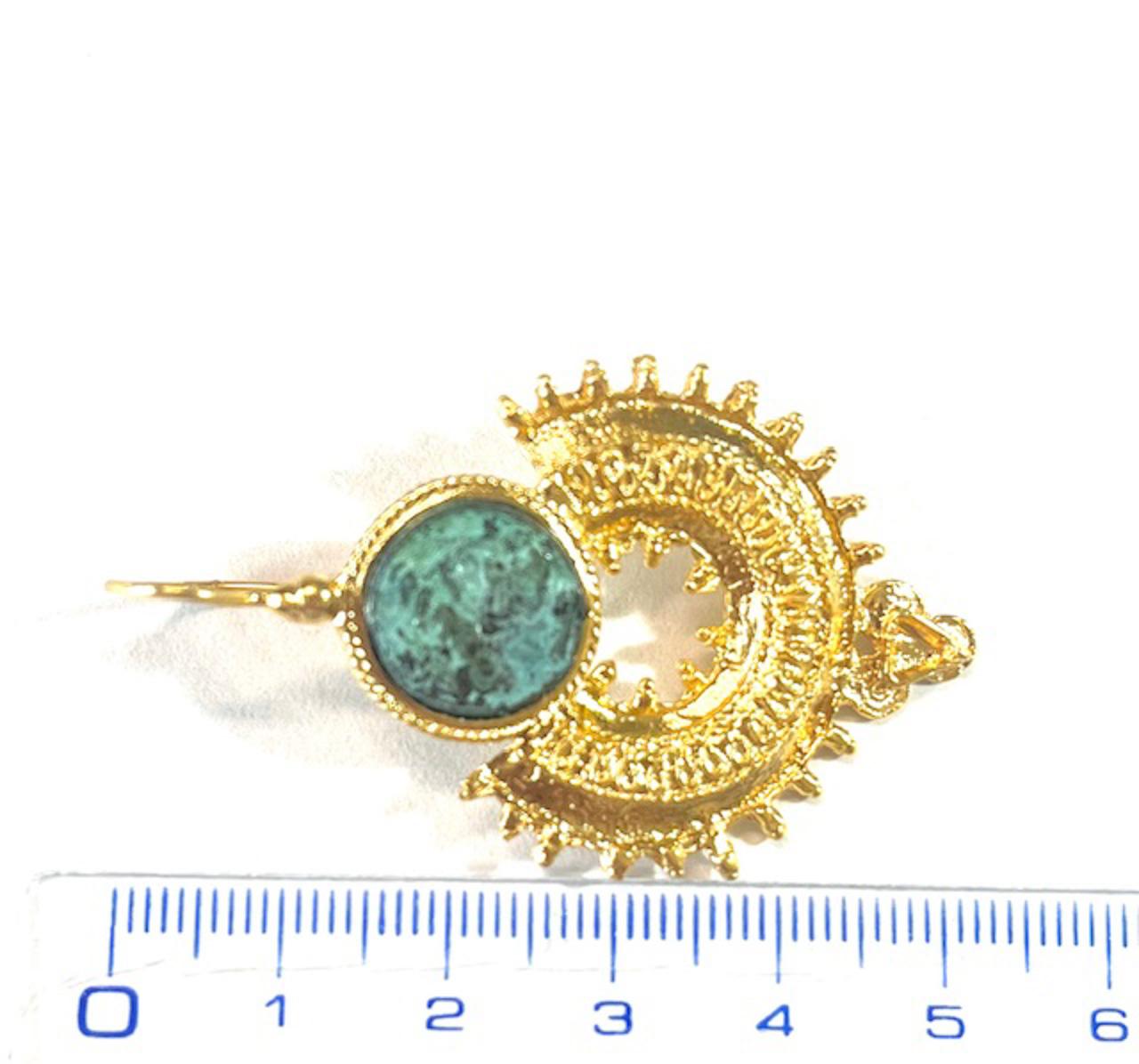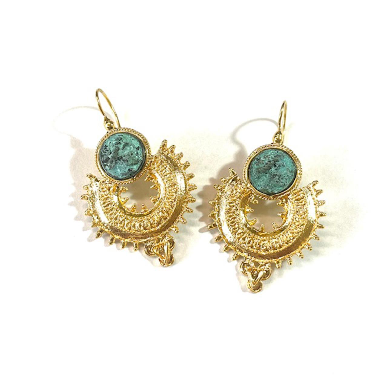 Hook earring in 925 sterling silver/°° 18k gold plated with antiqued bronze coins. Earring inspired by the Roman era, with an antiqued bronze coin set in a refined gold-plated setting. This earring recalls the elegance of ancient civilizations. The lower circular element embraces the coin, enhancing it and highlighting all its beauty.