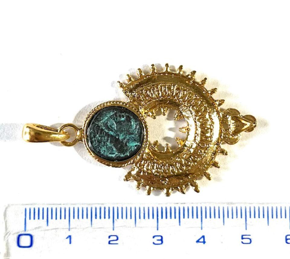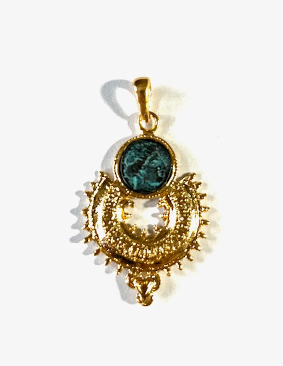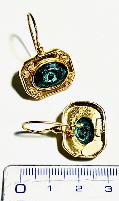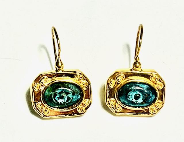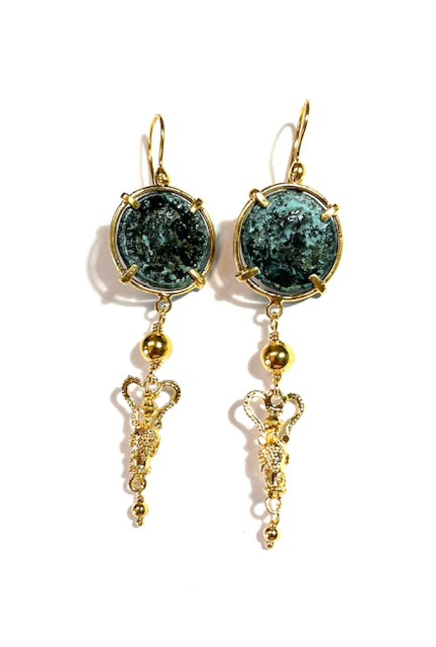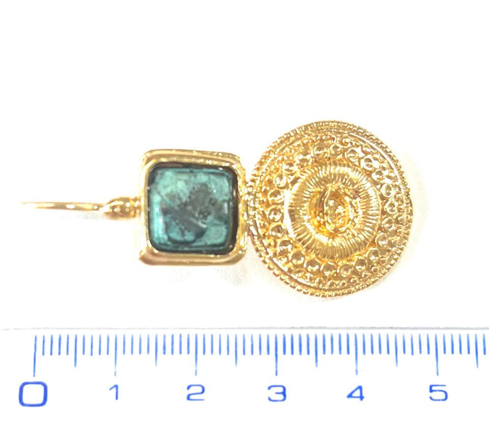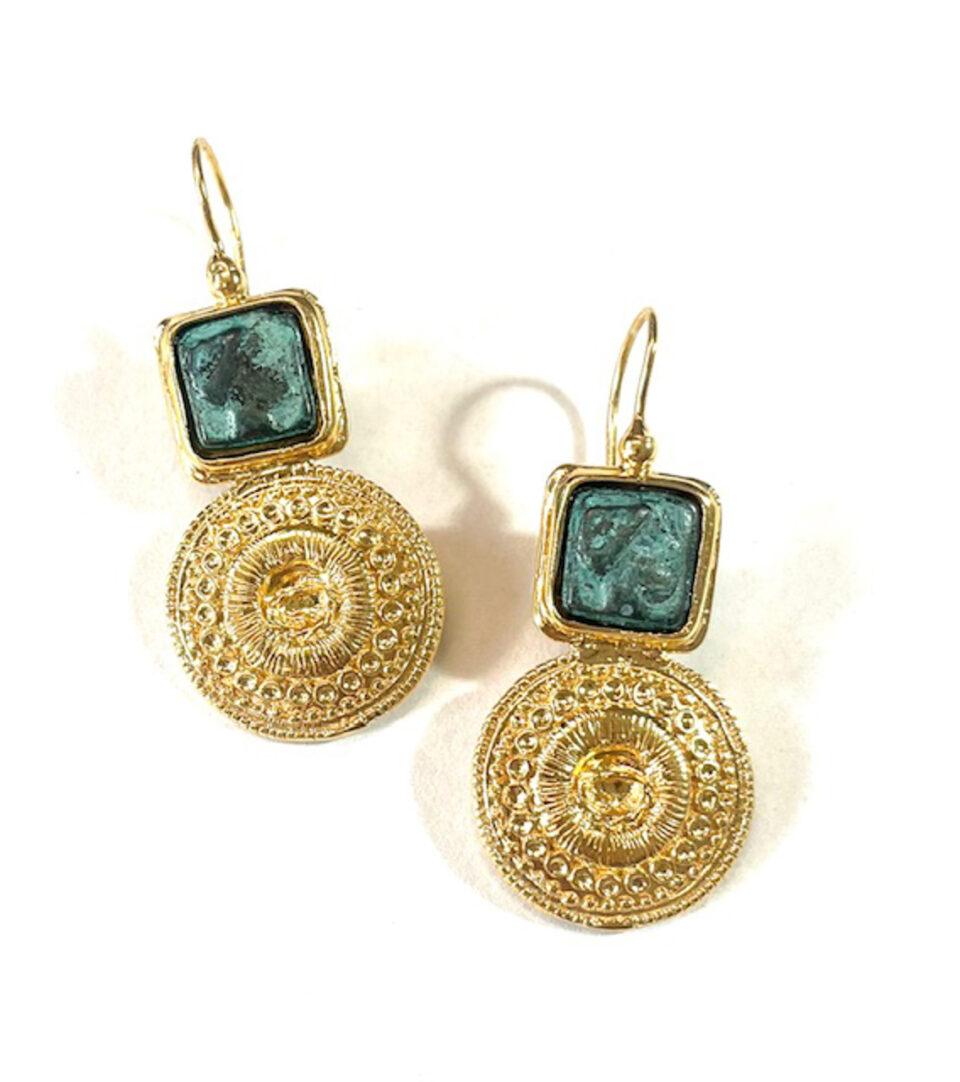 Hook earring in 925 sterling silver plated with 18k gold with central shield in antiqued bronze. A unique jewel with historical charm, inspired by the goldsmithing art of antiquity. The centerpiece of this earring is the central shield in antiqued bronze, crafted with extreme care to reproduce the authentic look of historical shields. The shield is set in a finely hand-worked bezel, embellished with elegant scrollwork that wraps it in every detail. An exclusive piece, perfect for those who love handmade elegance and echoes of past eras.