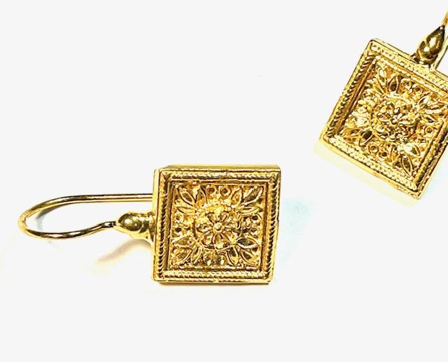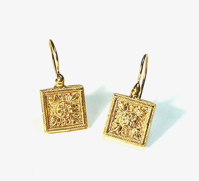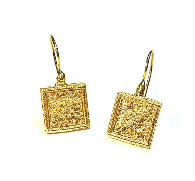 Hook earring in 925 sterling silver plated with 18k gold. An elegant, refined earring inspired by the sophisticated aesthetics of Etruscan art. At the center, a delicate floral motif catches the eye and adds a touch of preciousness to the entire composition. The back of the earring is finely worked with decorative openwork, adding depth and lightness, enhancing every detail with a play of solids and voids. A jewel that blends tradition and style, perfect for those who love to wear history with contemporary grace.
