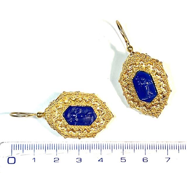 Hook earring in 925 sterling silver plated with 18k gold with glass paste. Elegant handmade earring crafted with the granulation technique, one of the most refined methods of ancient goldsmithing. At the center, a precious set glass paste depicts a delicate little angel holding Mercury’s caduceus: a staff topped with two open wings and wrapped by two intertwined serpents, a universal symbol of peace, balance and harmony. A jewel rich in meaning and history that combines the elegance of ancient Etruscan craftsmanship with a timeless symbolic message.