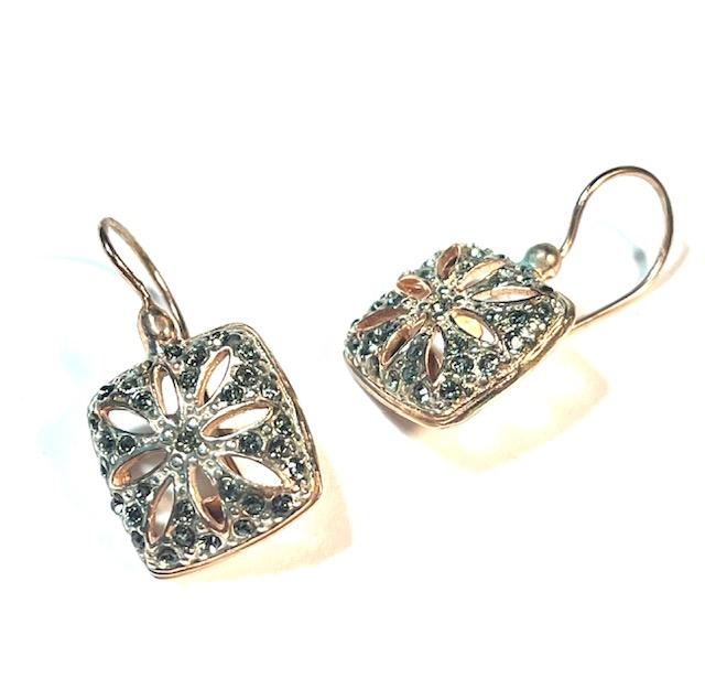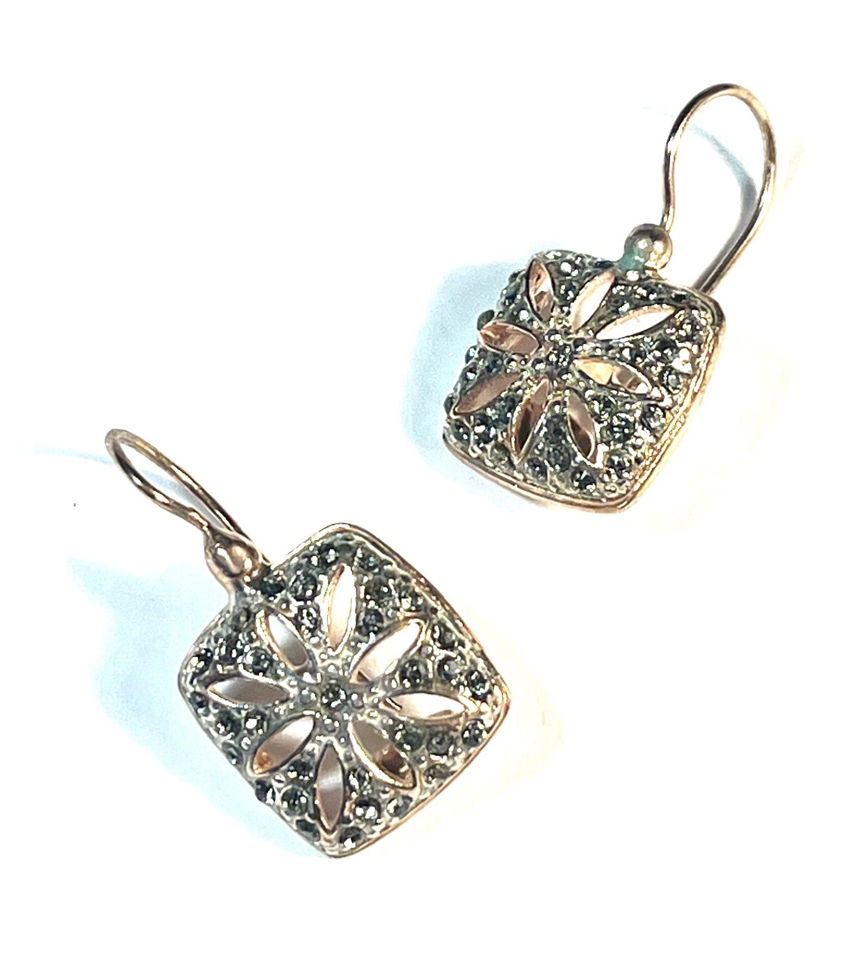 Hook earring in 925 sterling silver plated with 18 kt rose gold, featuring smoky Swarovski crystals. This refined antique-style earring is a tribute to the beauty of the past, reinterpreted in a modern key. The smoky Swarovski crystals set on the front recall iconic vintage jewelry rosettes, symbols of timeless elegance. The light reflected by the stones adds depth, character, and a soft yet enveloping brilliance to the wearer. Perfect to wear proudly at special events or to add a sophisticated touch even to the simplest outfits.