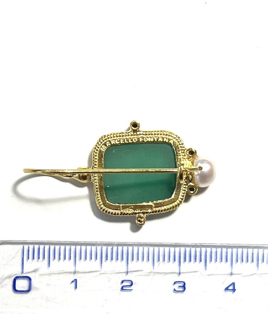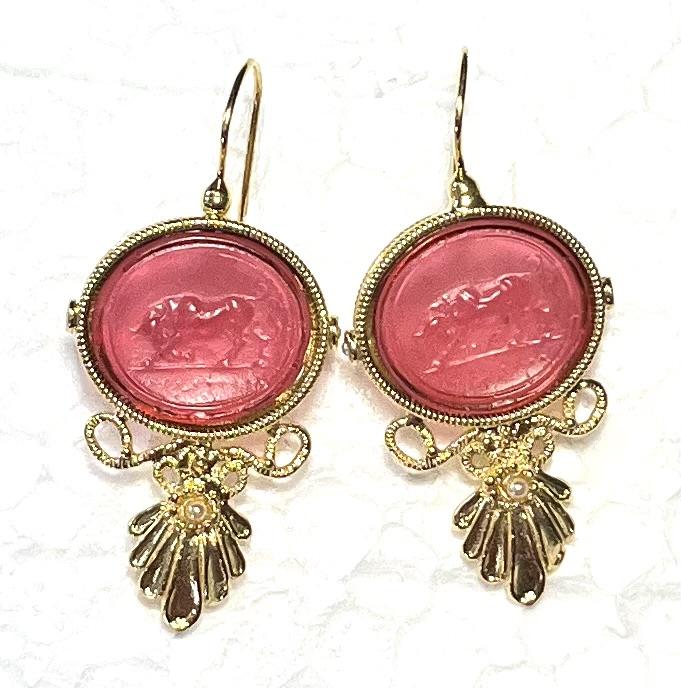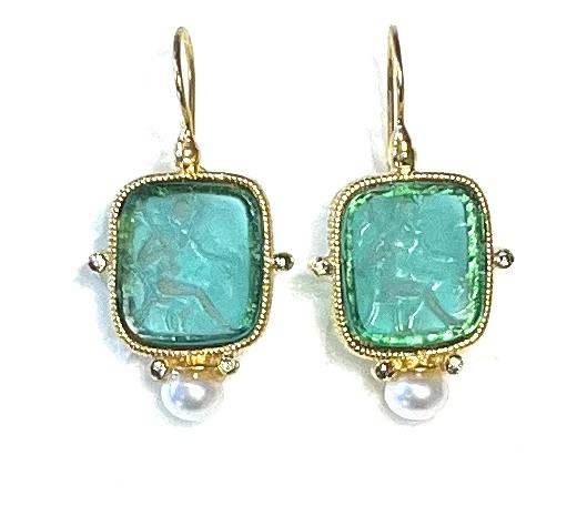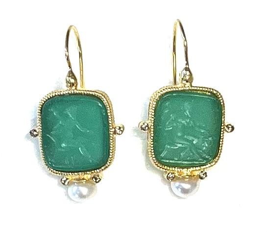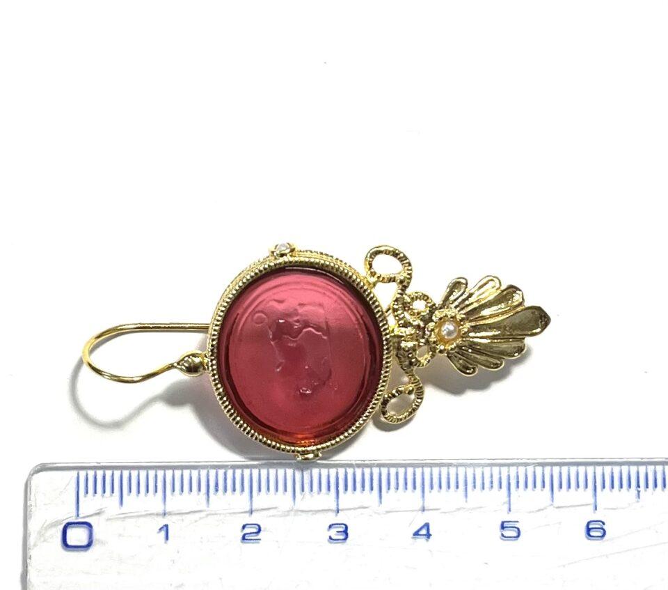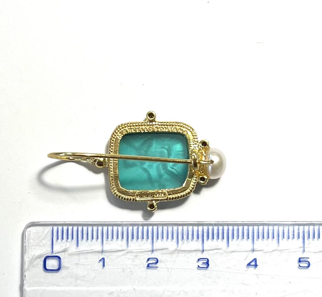 Hook earring with glass paste in 925 sterling silver/°° 18k gold plated. Earring depicting Bacchus, Roman version of the Greek god Dionysus, symbol of wine, celebration and sociality. The Bacchanalia were celebrations of joy and sharing. In the lower part, freshwater pearls and Swarovski add brightness, enhancing the elegance and refinement of the jewel.