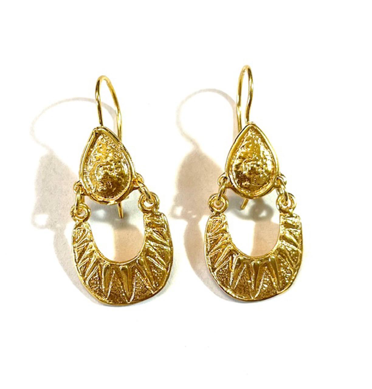 Hook earring in 925 sterling silver/°° 18k gold plated. Earring inspired by Etruscan art, with decorative elements that recall the ancient workmanship found in Etruscan vases and paintings. Made with the micro-casting technique, it enhances the play of chiaroscuro and brightness, giving depth and refinement to the design. A jewel with historical and timeless charm.