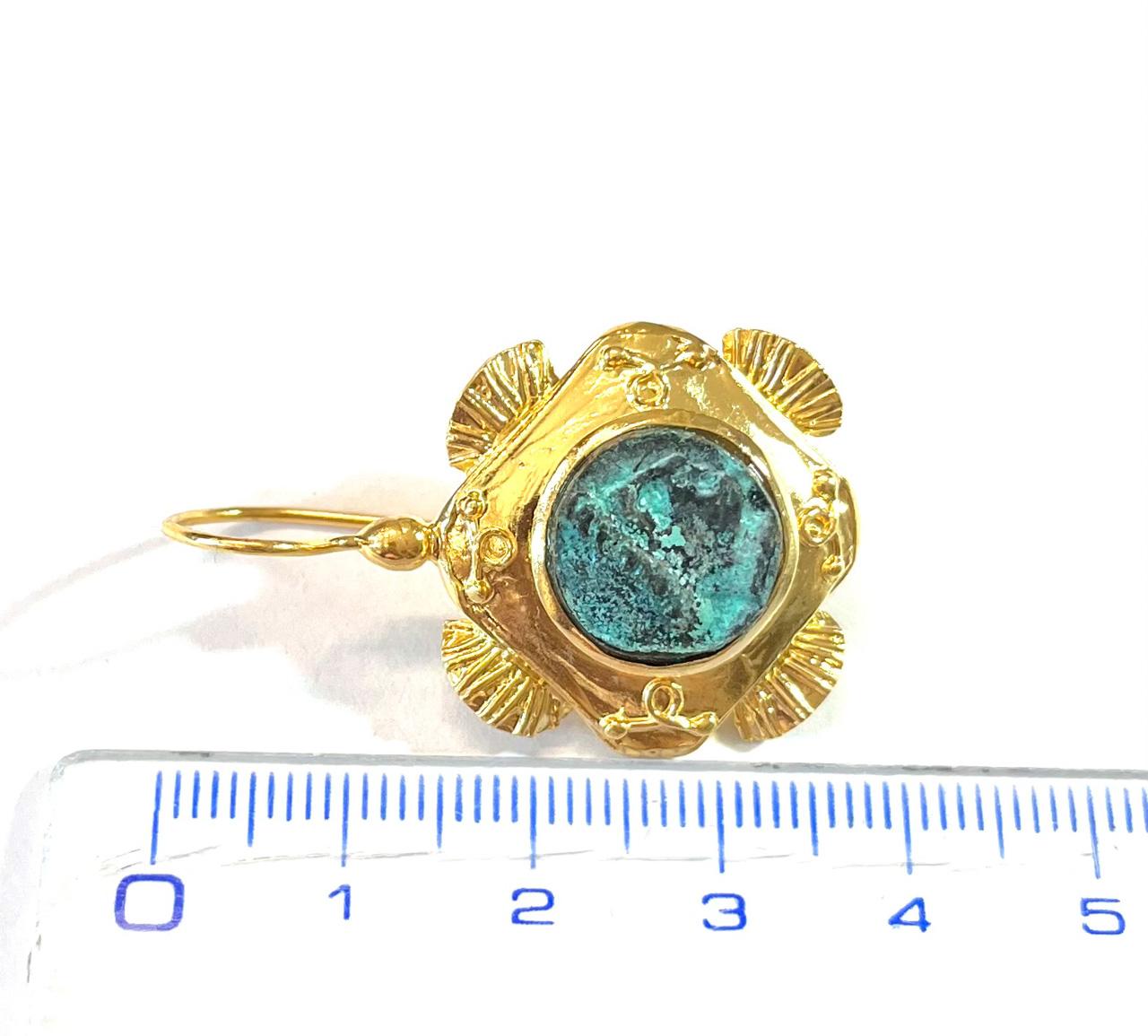 Hook earring in 925 sterling silver/°° 18k gold plated with antiqued bronze coins. This elegant earring features a central coin that recalls the Romanesque style, depicting historical figures of great importance such as kings and generals. The bezel, with detailed workmanship, is surrounded by fan-shaped elements that evoke fabric draperies, giving the jewel a majestic appearance. A design that combines tradition, art and symmetry, creating a contrast between the solidity of the coin and the lightness of the draperies.
