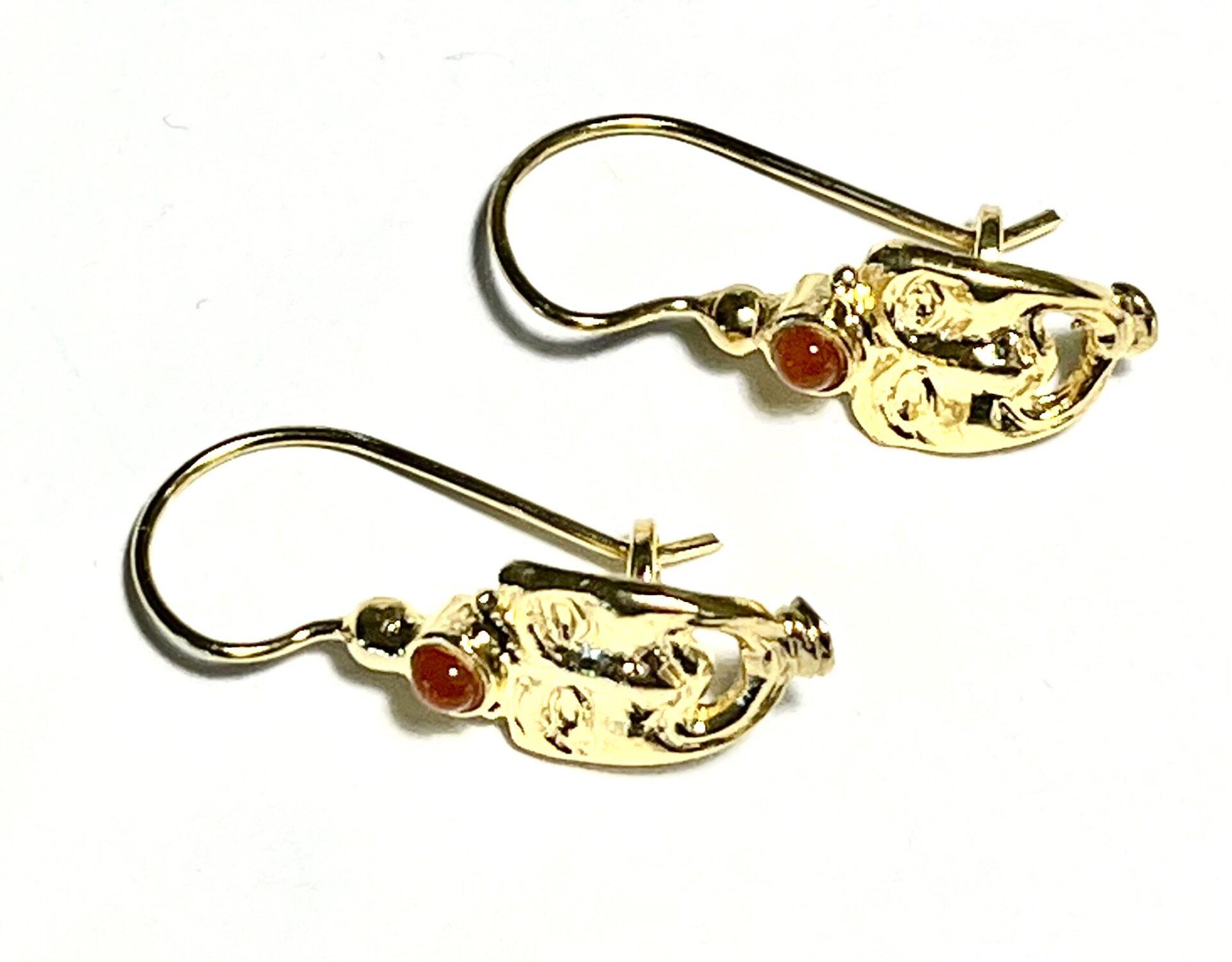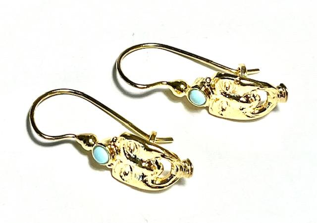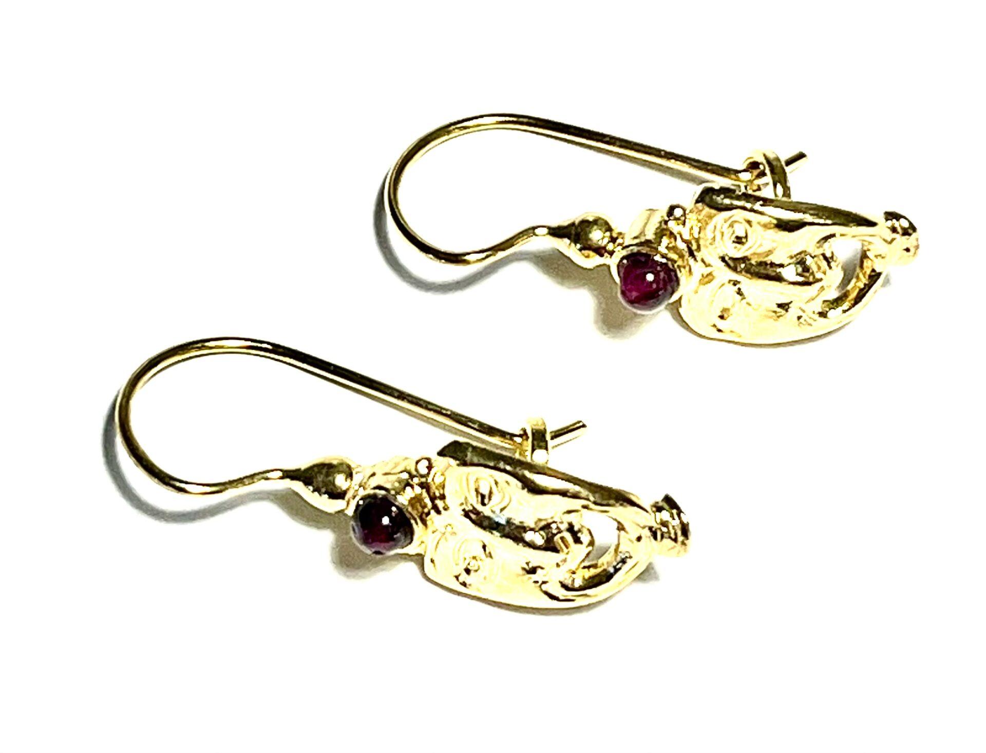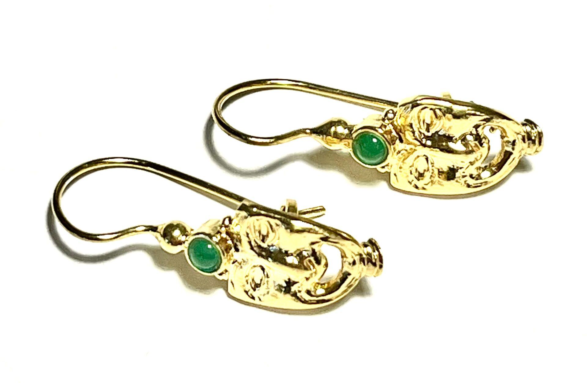 Hook earring in 925 sterling silver plated with 18k gold. Elegant Etruscan-style earring, characterized by the classic Etruscan mask, a symbol of protection and spirituality, evoking the mystery and tradition of an ancient civilization. The upper part is embellished with a set stone, a symbol of strength and beauty, which finishes and enhances the piece, making it harmonious and refined. A jewel that combines the charm of history with the elegance of contemporary design.