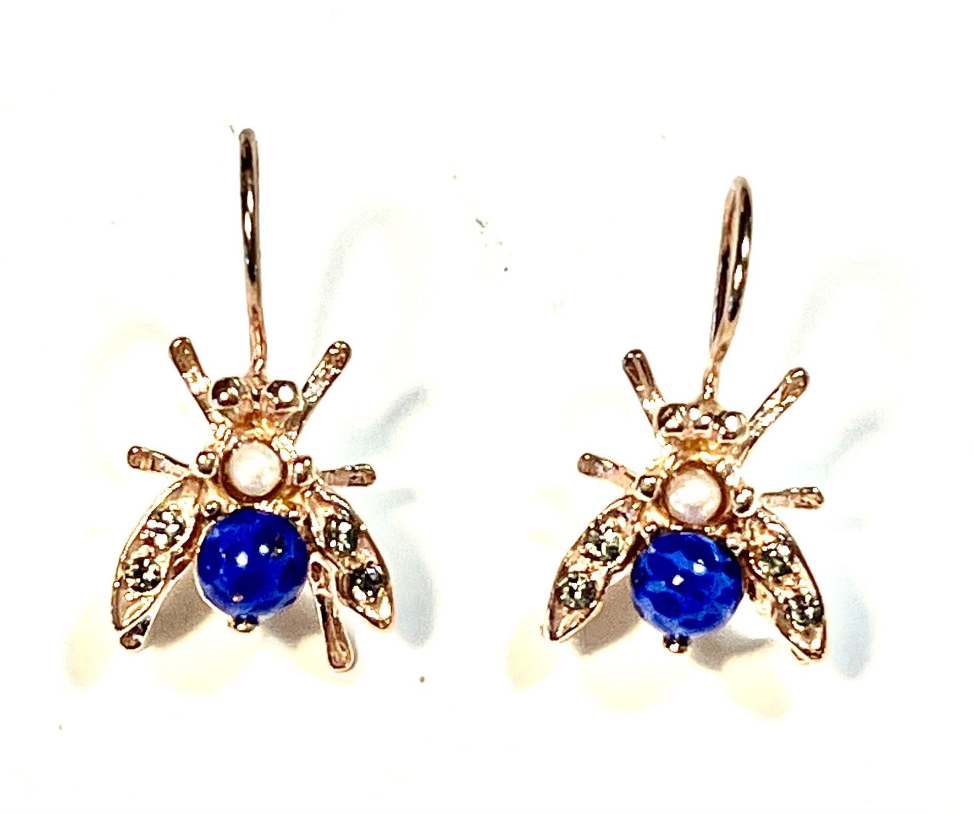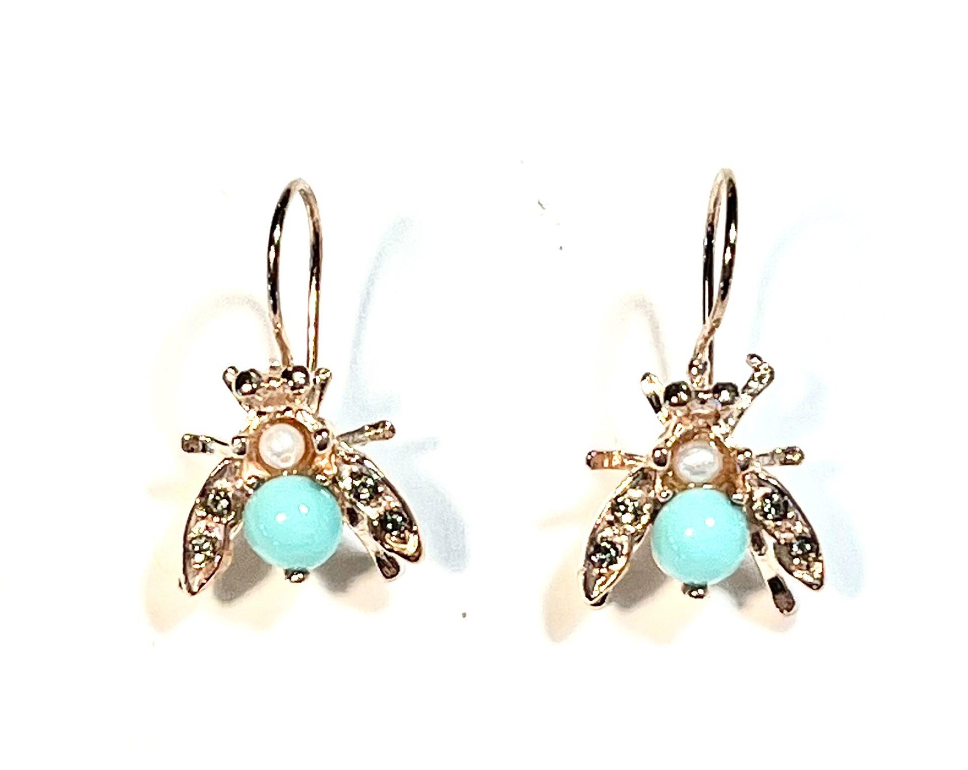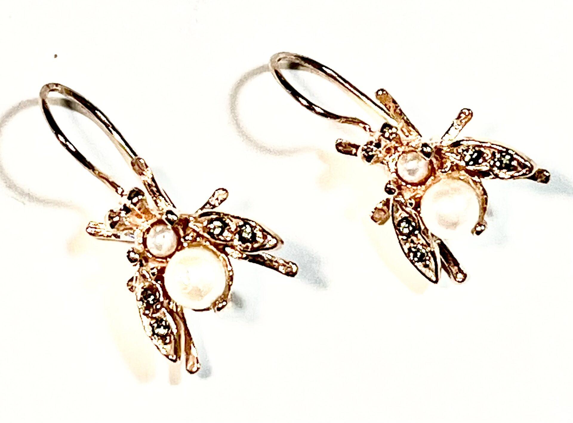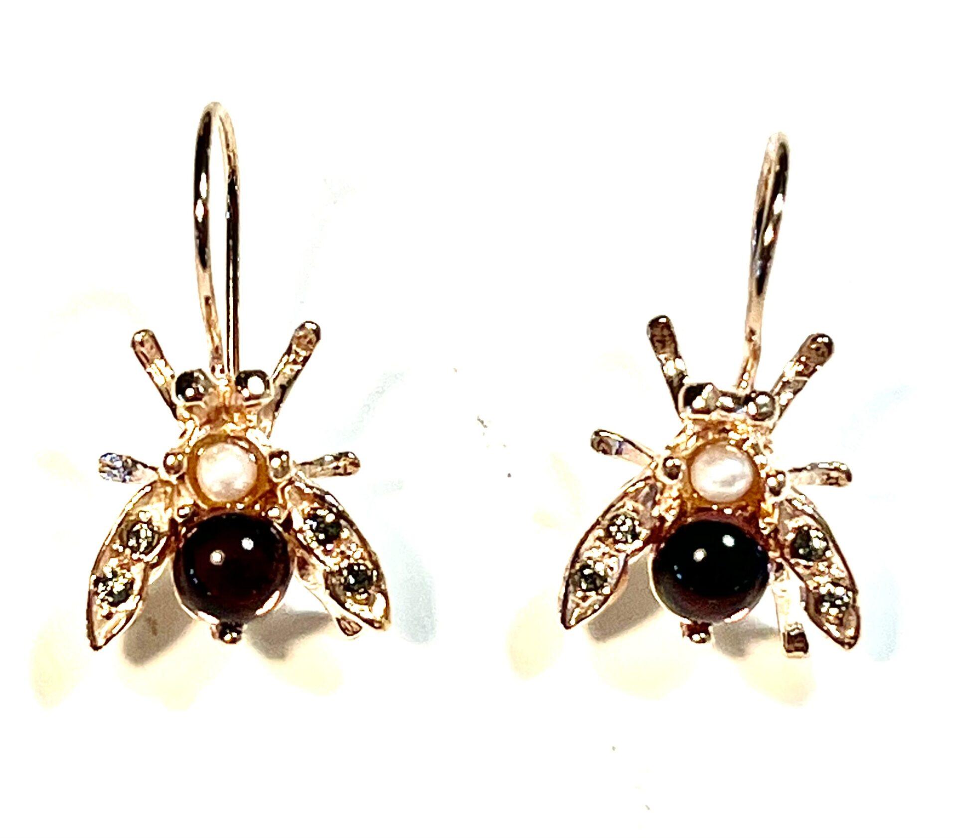 Hook earring in 925 sterling silver plated rose gold 18 kt. Refined antique-style earring inspired by the bee, a symbol of industriousness, harmony and rebirth since antiquity. This small sacred emblem was often associated with royalty and the connection between the earthly and spiritual worlds. The bee is embellished with freshwater pearls, Swarovski crystals and semi-precious stones, carefully set to create elegant reflections and give brightness to the jewel. Perfect for those who love the balance between nature, meaning and fine craftsmanship.