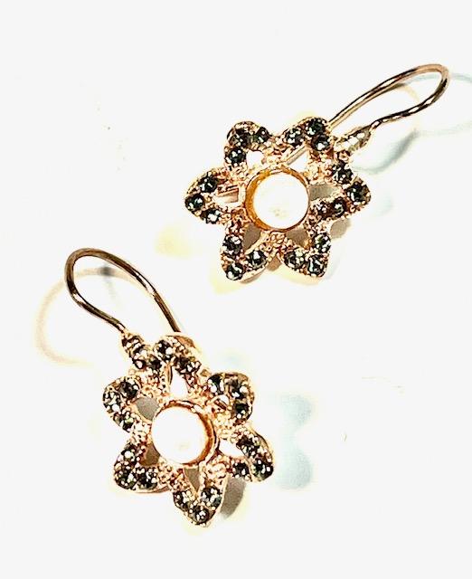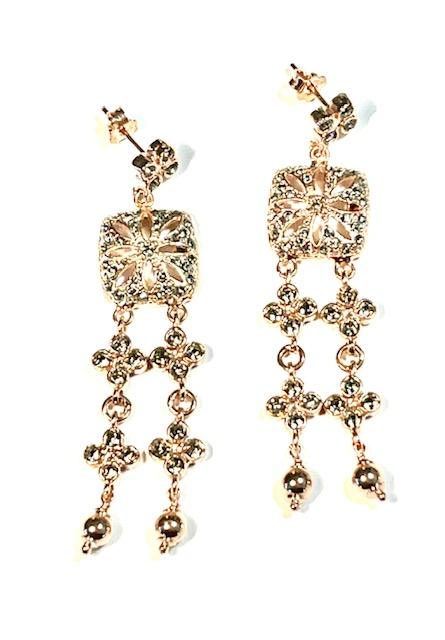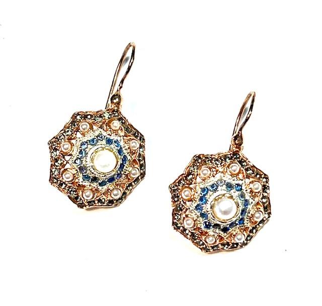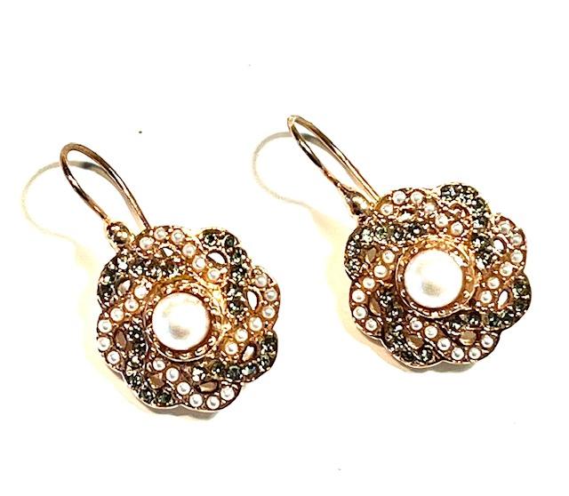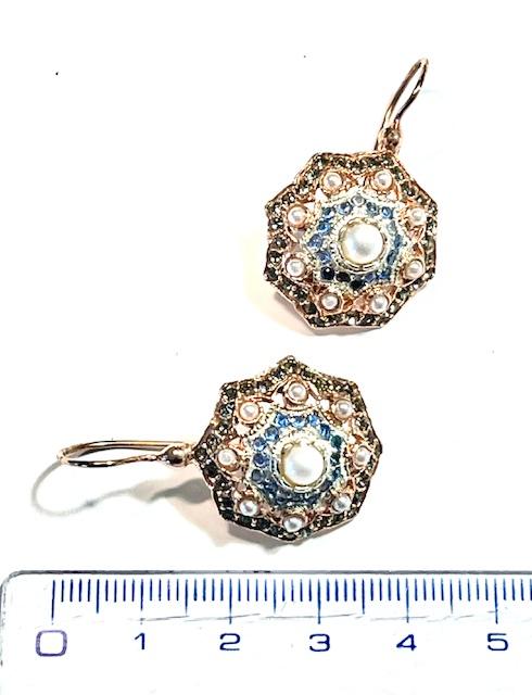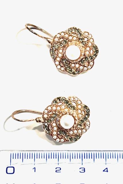 Hook earring in 925 sterling silver plated rose gold 18 kt, with stones swarovski, pearls and peridoto.