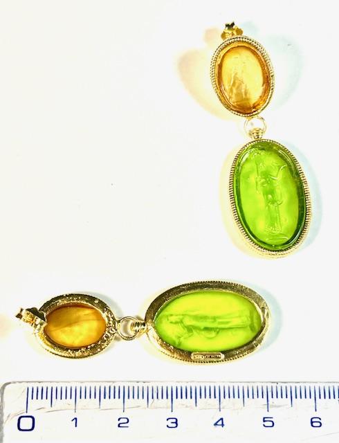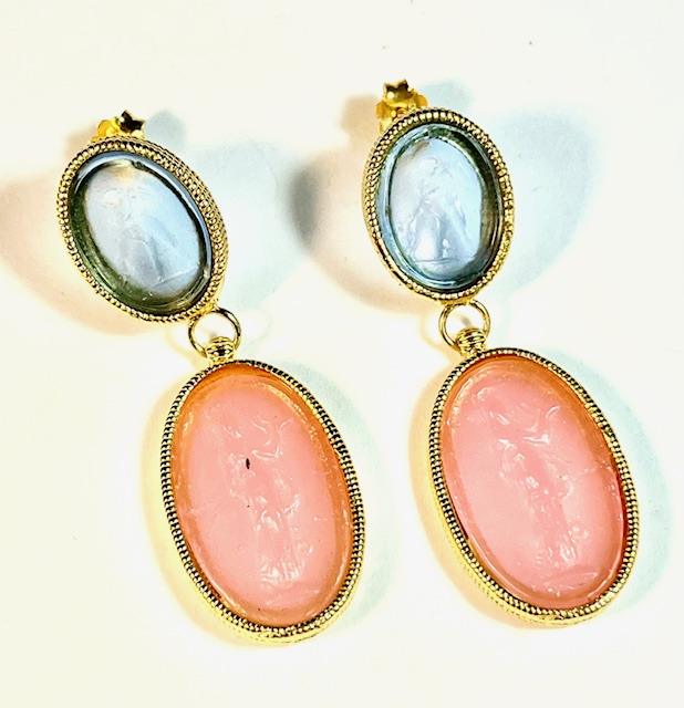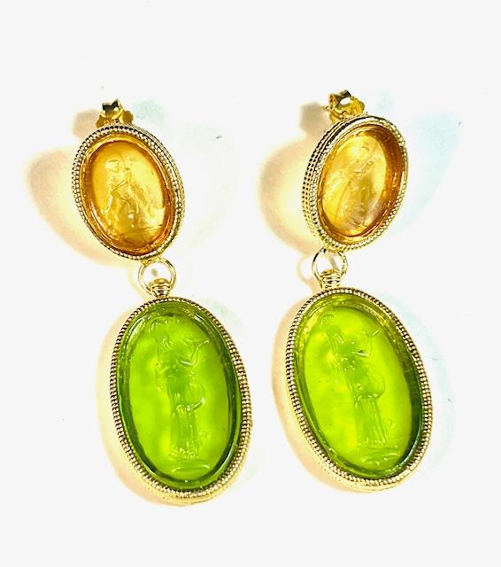 Stud earring in 925 sterling silver plated with 18k gold with glass paste. Handcrafted earrings with twisted-wire bezels, embellished with two colored glass pastes of different sizes joined at the center with a hinge. The smaller one depicts a little angel with a dog, symbol of divine protection and spiritual guidance. The larger one represents Salus, the ancient Roman personification of health and collective prosperity, linked to the cult of Semo Sanctus. A jewel that combines elegance, meaning and tradition in a unique, timeless form.