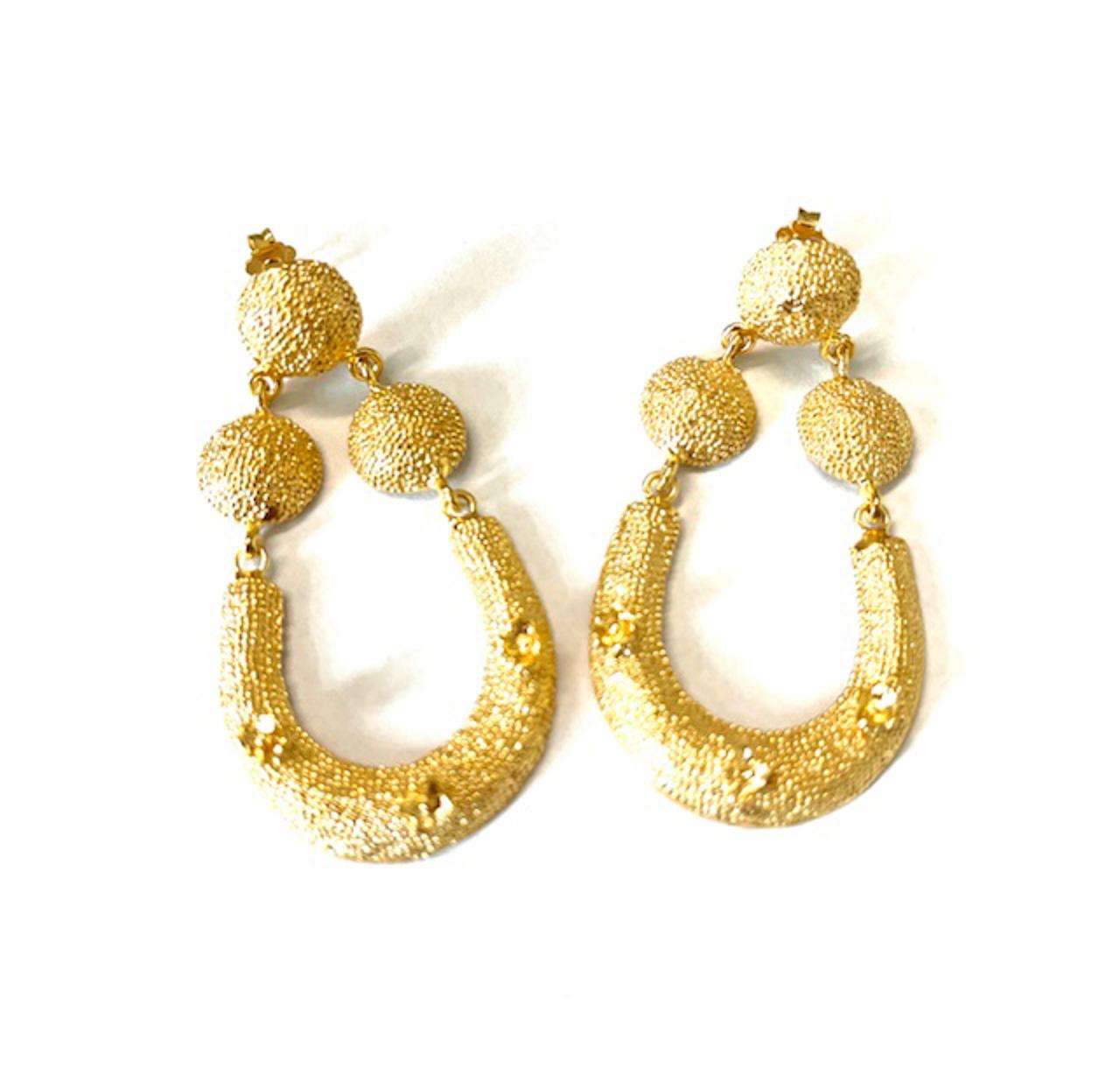 Stud earring in 925 sterling silver/°° 18k gold plated. Elegant earring in Etruscan style, made with handmade workmanship and embellished with the granulation technique. This ancient method, which involves the application of tiny metal spheres, enhances the volumes and plays of light, giving depth and refinement to the jewel. A unique piece that recalls the goldsmith mastery of the ancient Etruscans.