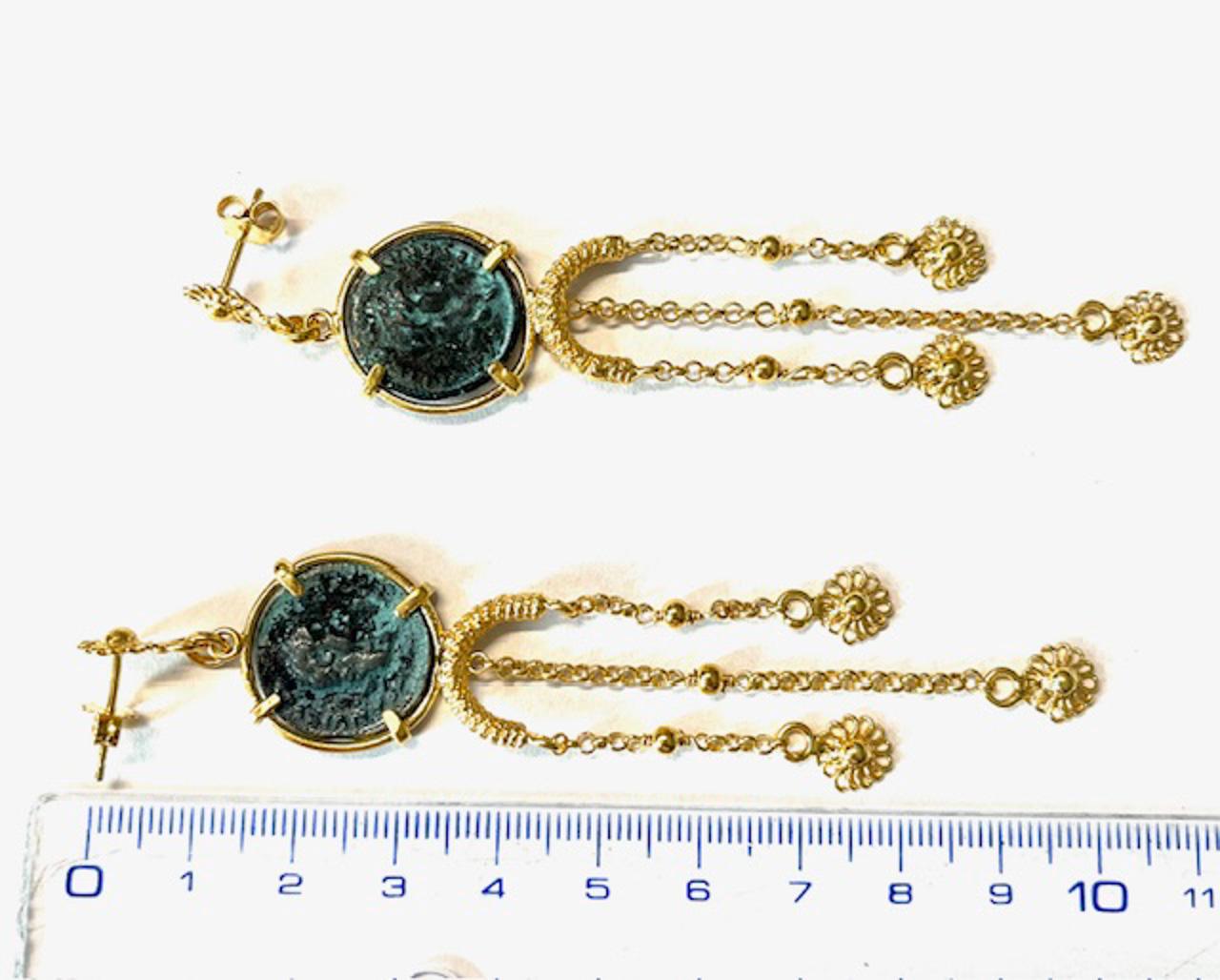 Stud earring in 925 sterling silver/°° 18k gold plated with antiqued bronze coins. This elegant earring in 925 sterling silver is embellished with an antiqued bronze coin, set with four prongs that enhance its design. The coin, depicting the emperors and coinage of ancient Rome, evokes the greatness of the empire. The lower part is enriched with an element soldered to the coin, from which three rolo chains hang, each with a small polished sun at the end, adding brightness and movement to the jewel. A refined accessory that combines history, elegance and symbolism.