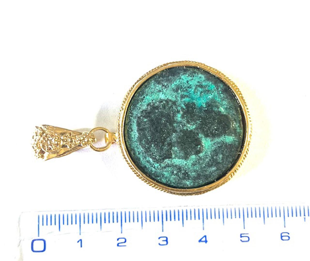 Pendant in 925 sterling silver/°° 18k gold plated with antiqued bronze coin. Pendant inspired by the Roman era. With an antiqued bronze coin set in a refined gold-plated mounting, this pendant recalls the elegance of ancient civilizations. The hook decorated with a floral motif adds a touch of refinement, making this jewel unique and imbued with history.