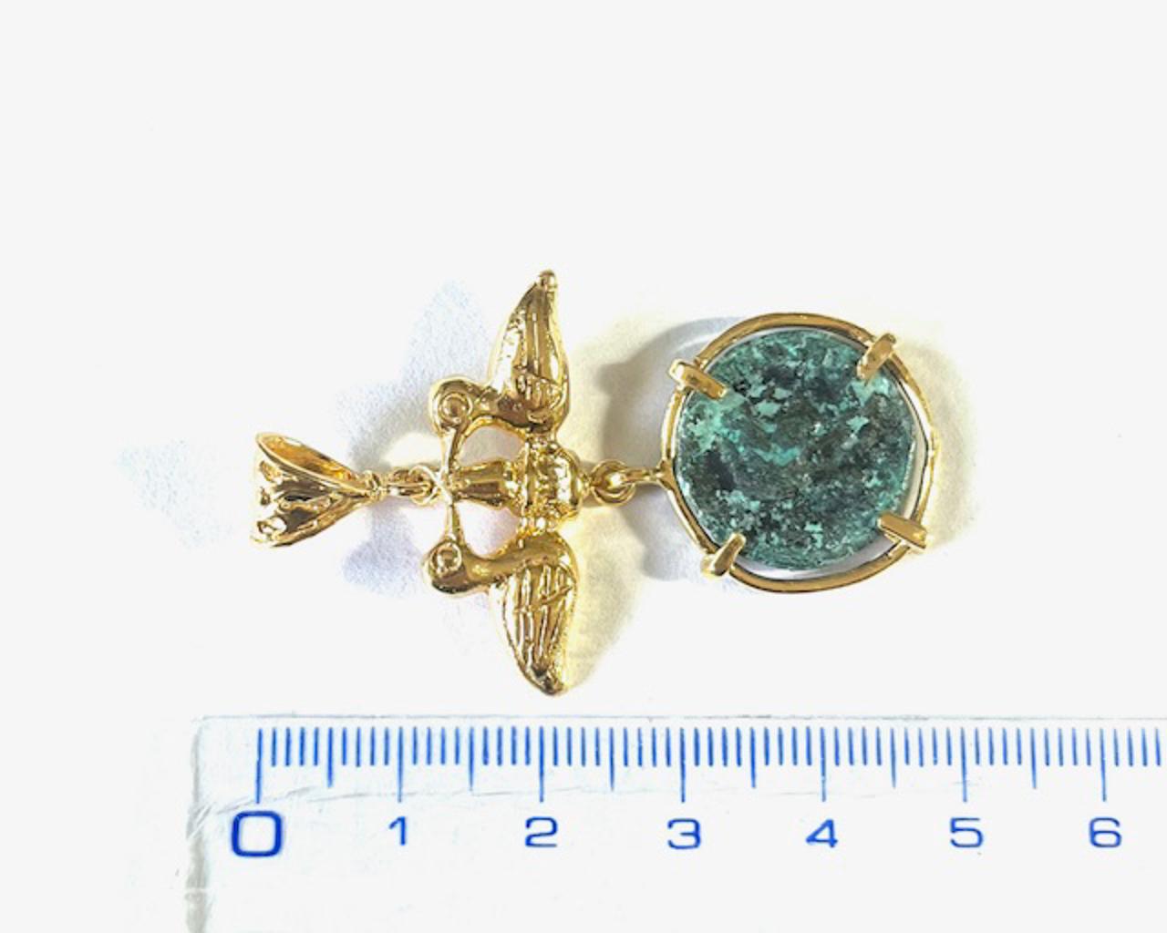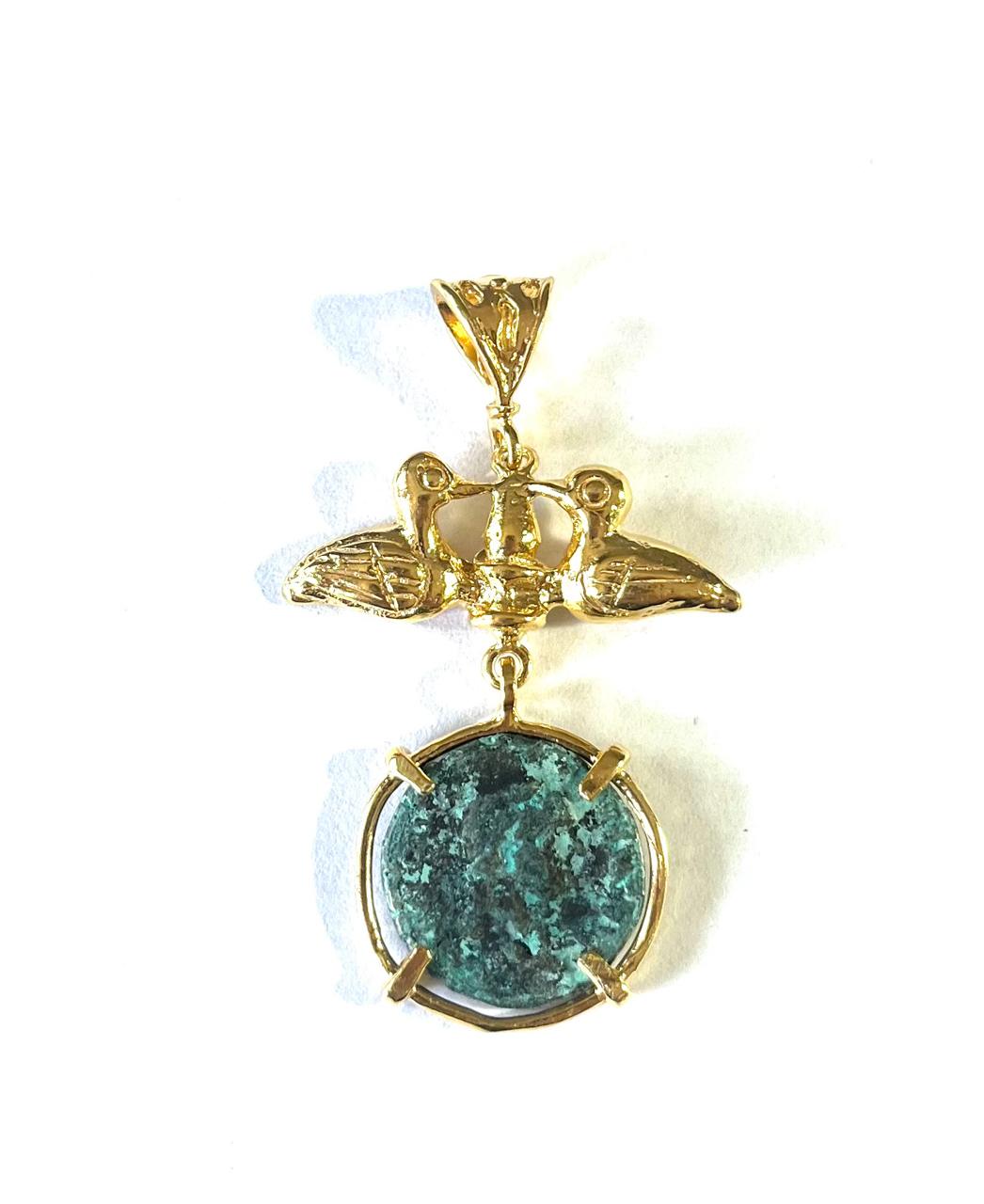 Pendant in 925 sterling silver/°° 18k gold plated with antiqued bronze coin. Pendant inspired by the Roman era with an antiqued bronze coin set in a gold-plated prong mounting. The two small geese facing each other, symbol of balance and protection, enrich the design, recalling connection and cooperation. A jewel that celebrates the greatness of ancient Rome, symbolizing strength, harmony and vigilance, giving the wearer elegance and refinement. A unique piece that combines history and timeless beauty.