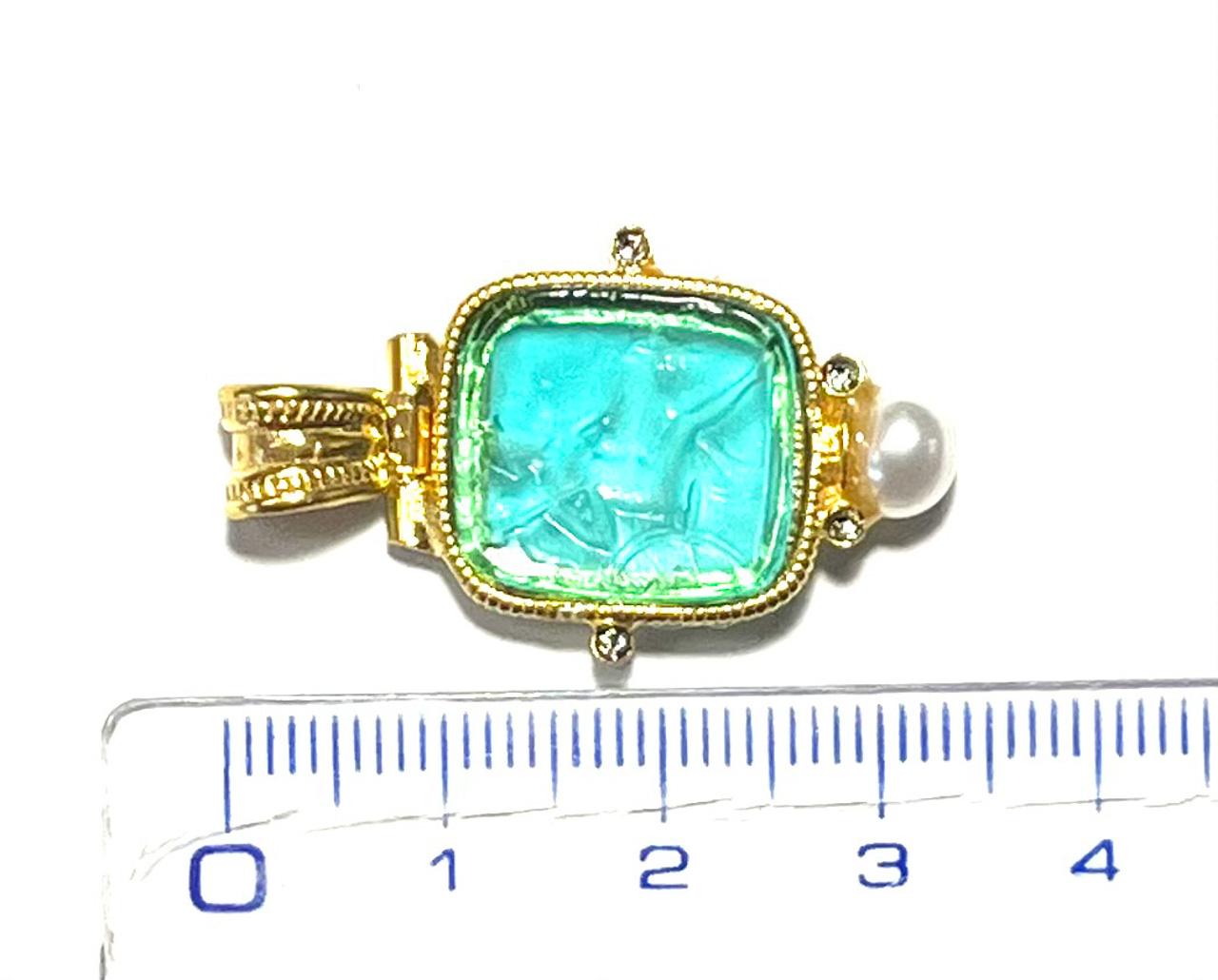 Pendant with glass paste in 925 sterling silver/°° 18k gold plated. Pendant with glass paste inspired by papal seals from the Roman era, depicting Bacchus, the Roman representation of the Greek god Dionysus, symbol of celebration and conviviality. Embellished with a final pearl and two Swarovski crystals, it gives brightness and elegance, enhancing the refinement of the design.