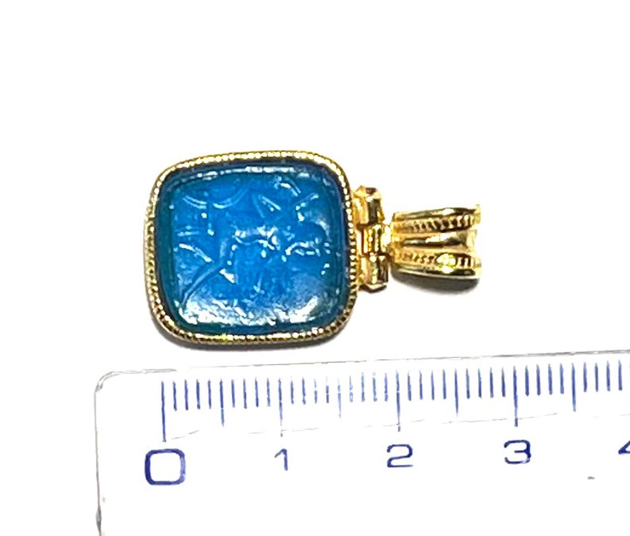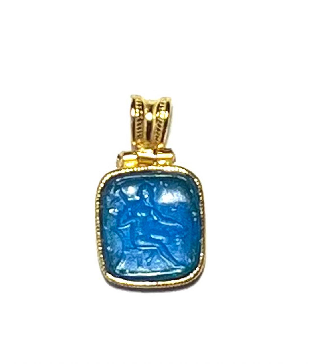 Pendant with glass paste in 925 sterling silver/°° 18k gold plated. Elegant pendant with bluish glass paste, wrapped in a twisted-wire mount that enhances its brilliance. The glass paste depicts Bacchus, god of wine and celebration, symbol of joy and sharing. A jewel that celebrates vital energy and the convivial spirit of antiquity. A pendant with exclusive charm, inspired by antiquity, able to enhance the elegance and personality of the wearer. A unique jewel that combines history and refinement.