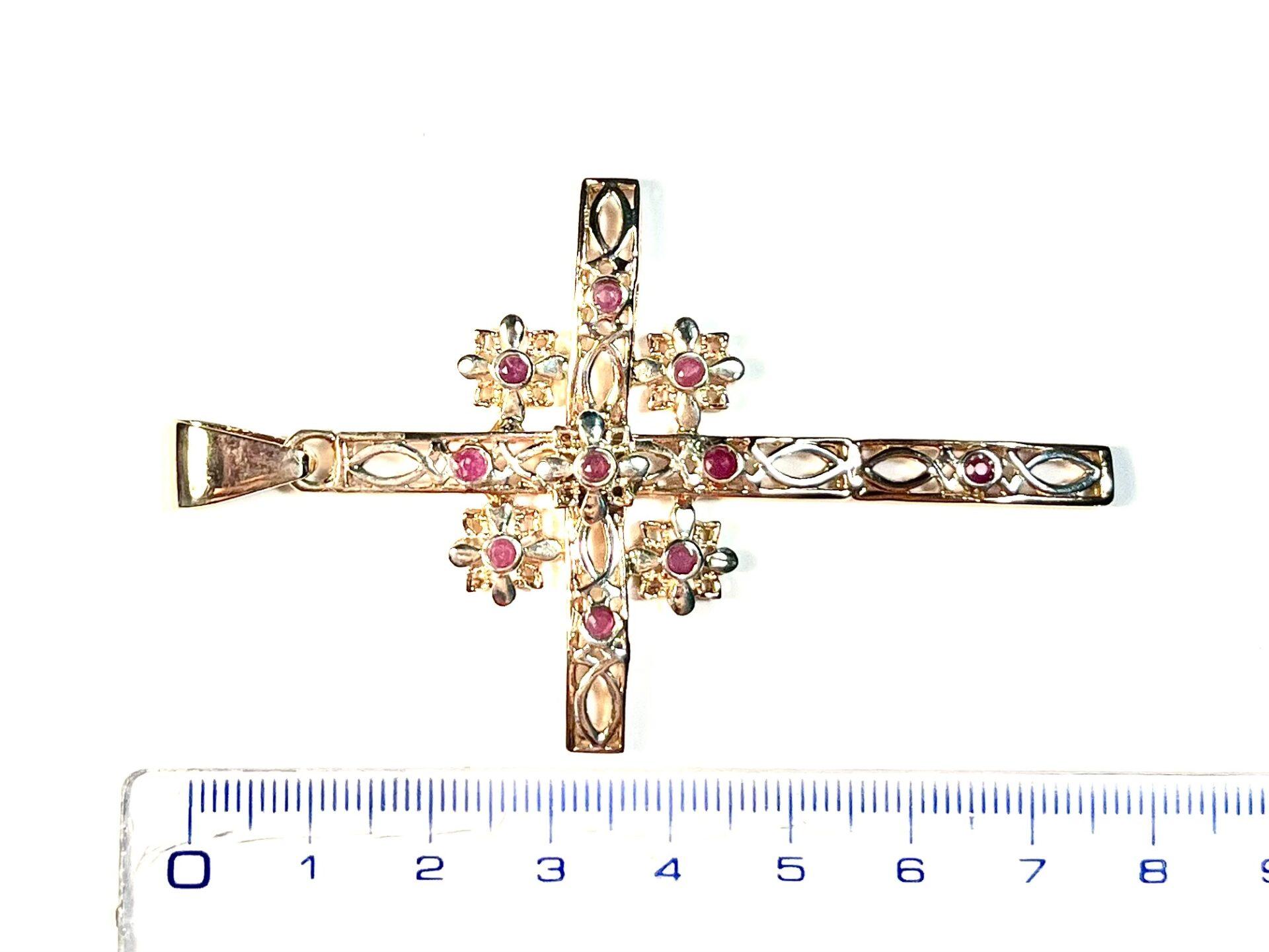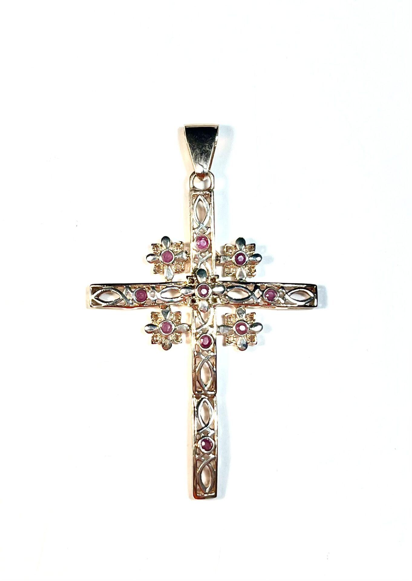 Pendant in 925 sterling silver plated rose gold 18 kt with red hydrothermal stones. An elegant silver cross-shaped pendant, embellished with a refined composition of small bezels that form a delicate central flower. The red hydrothermal stones add a touch of brightness and character, making this jewel a distinctive accessory rich in meaning. Some parts of the cross are intentionally polished to create silvery contrasts that enhance the handcrafted workmanship and highlight the floral details, giving depth and refinement to the overall design.