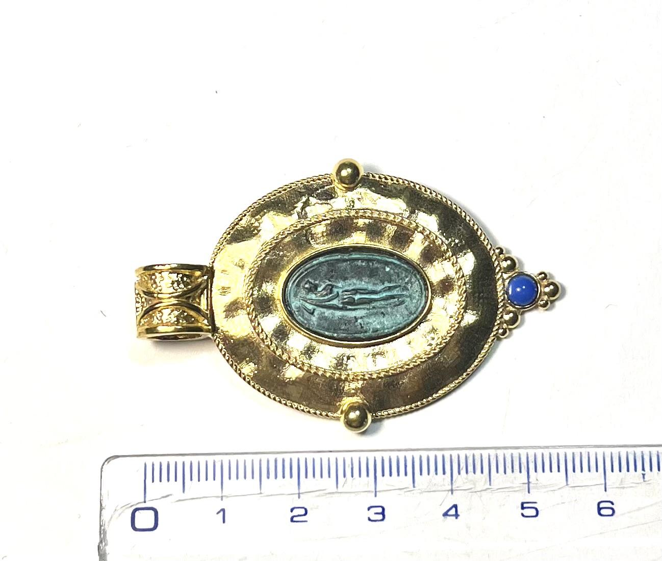 Pendant in 925 sterling silver plated 18k gold, with antiqued coin. A jewel with an antique and refined charm, this pendant catches the eye thanks to its central element: a shield that encloses an antiqued coin, symbol of history and prestige. The handmade work of the shield enhances its volumes with meticulous chasing, while the two turns of twisted wire that frame it add character and a classic-taste elegance. Completing the design, a small bezel with a blue agate semi-precious stone embellishes the lower part, adding a refined note of color. Perfect for those who love unique details and references to tradition, this pendant is a timeless accessory, able to tell an ancient story with a deeply contemporary style.